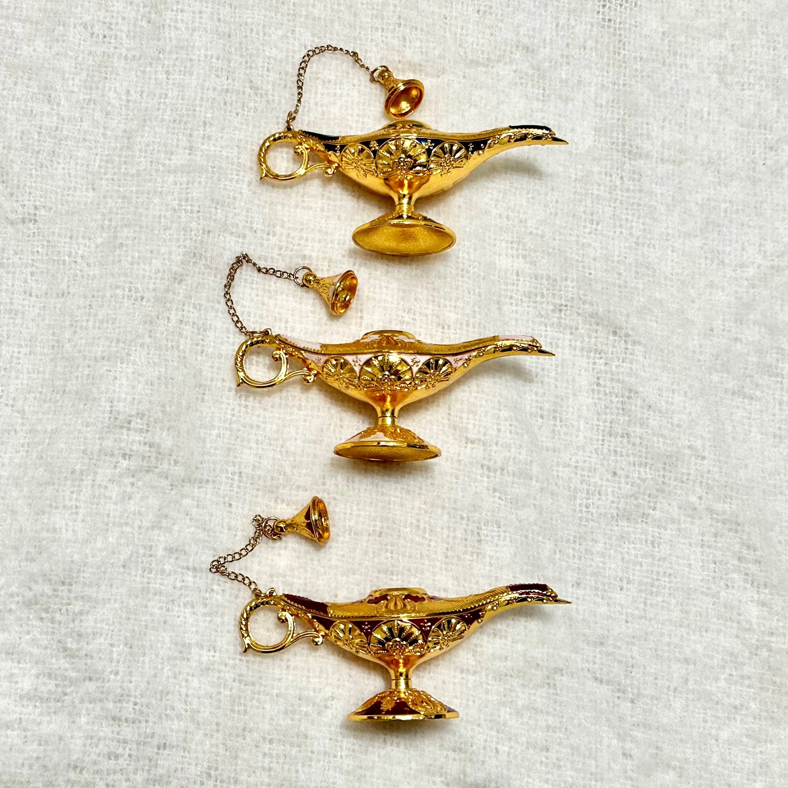 尺寸迷你,燈身呈流線型設計,以金色作主色,具阿拉伯紋飾,壺尾金鍊連壺頂蓋子;設有三款,一款以白色作底色,一款以深藍色作底色,另一款則以深紅色作底色。